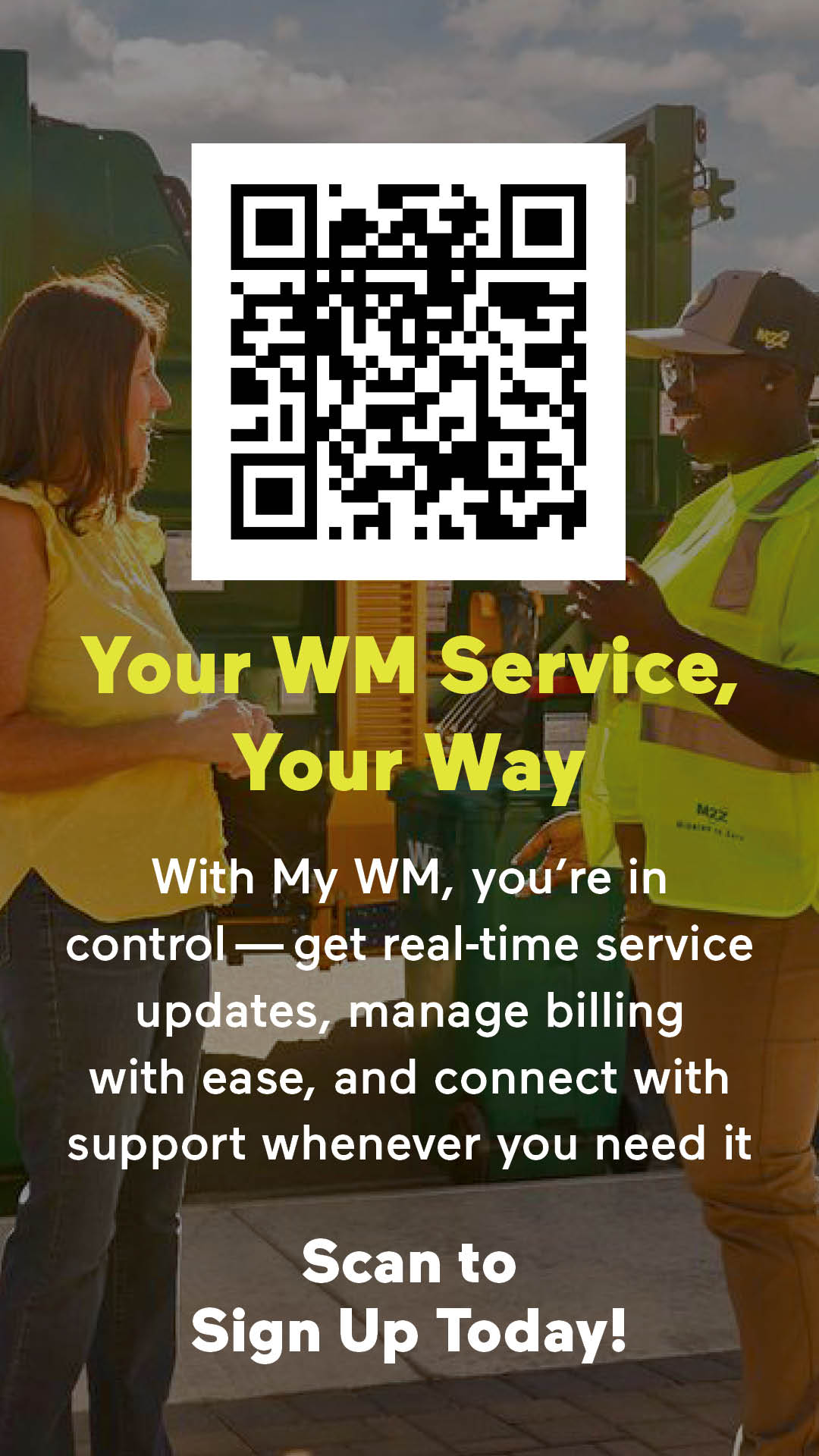 Sustainability starts in the community. With WM as your partner, you can count on reliable service and solutions that help keep our community sustainable, clean and safe. Thank you for partnering with WM, for a sustainable tomorrow.